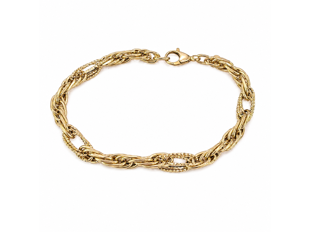 Tento luxusní náramek ze žlutého zlata vyniká originálním designem, kde se střídají hladké a jemně strukturované články. Kombinace různých povrchových úprav vytváří zajímavý kontrast lesku a brusu, díky kterému šperk působí velmi živě a sofistikovaně.