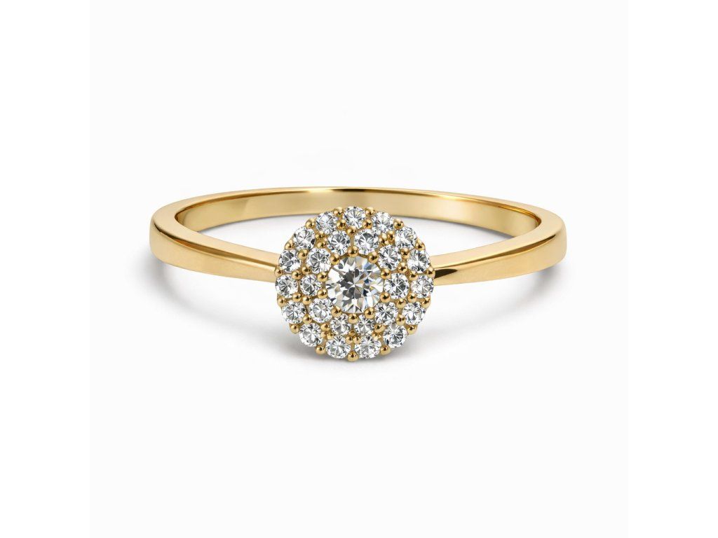 Luxusní prsten ze žlutého zlata 14 kt zaujme svým výrazným, ale stále elegantním designem. Dominantou šperku je centrální čirý kámen (zirkon), který je obklopen bohatou korunou menších zirkonů vytvářejících efekt zářivého halo.