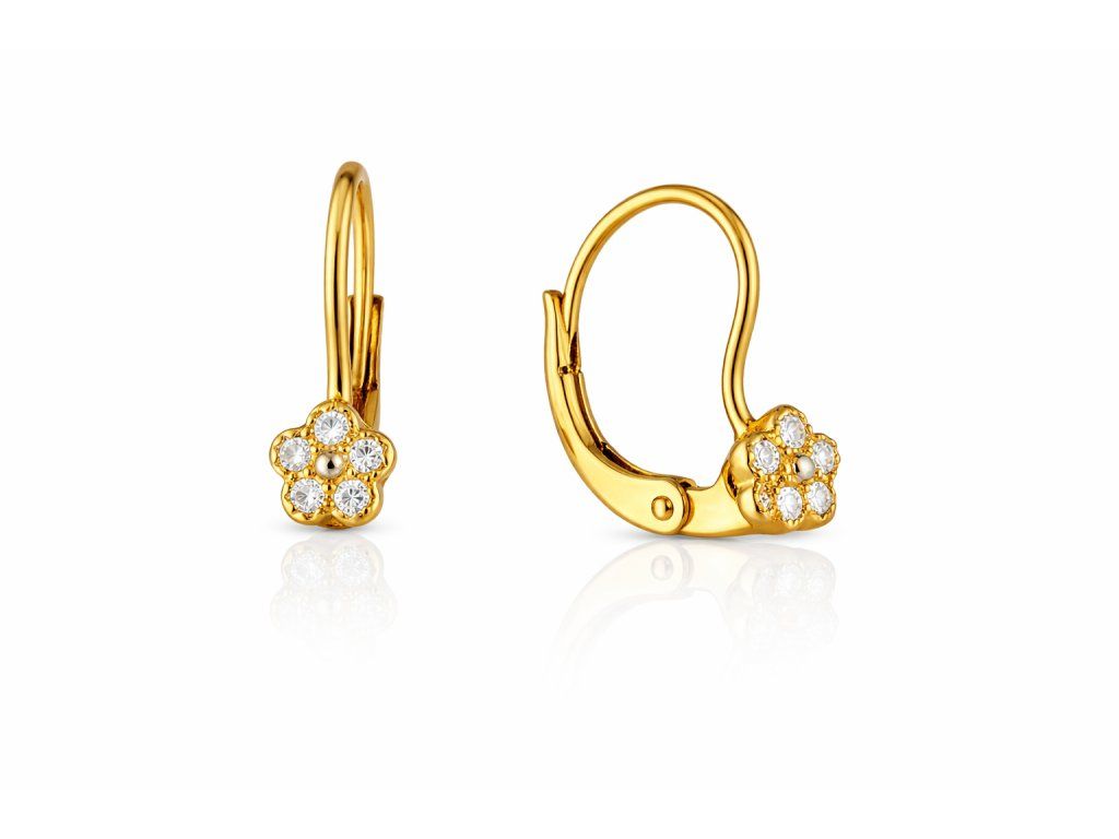 Tyto jemné zlaté náušnice zaujmou roztomilým motivem kytičky, zdobené drobnými zirkony, které dodávají šperku jemný a hravý třpyt. Kombinace žlutého zlata a světlých kamenů vytváří něžný a elegantní vzhled ideální i pro děti.