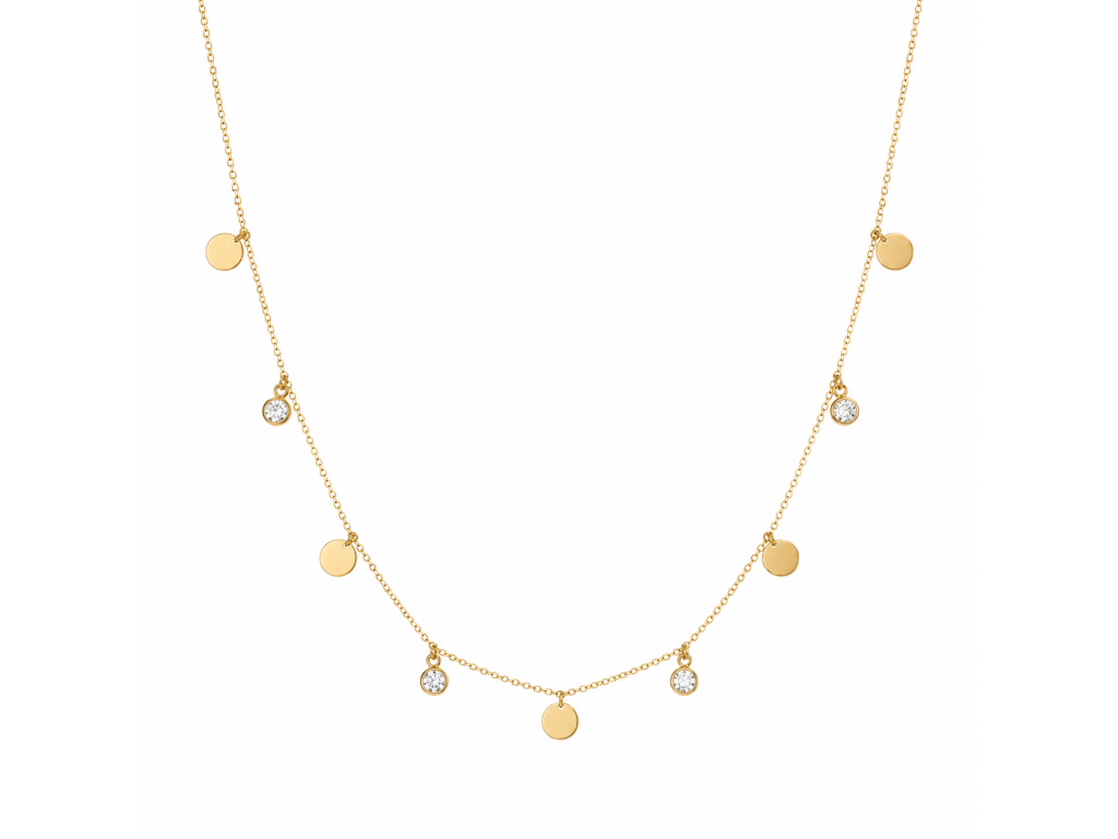 Tento elegantní náhrdelník ze žlutého zlata zaujme svou vzdušností a hravým designem. Jemný řetízek je doplněn o drobné kulaté destičky a třpytivé zirkony v decentním osazení, které se při pohybu krásně lesknou a dodávají šperku živost.