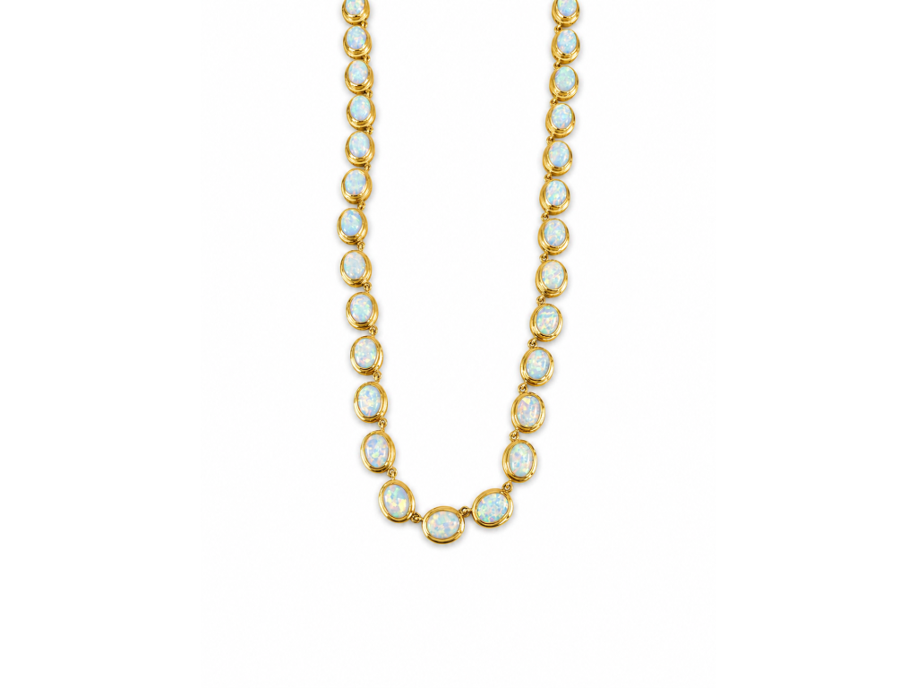 Opalit vyniká mléčně světlým odstínem s modrými, růžovými a zlatavými odlesky, které se mění podle dopadu světla. Pravidelné osazení kamenů po celé délce šperku dodává náhrdelníku harmonii, lesk a luxusní charakter.