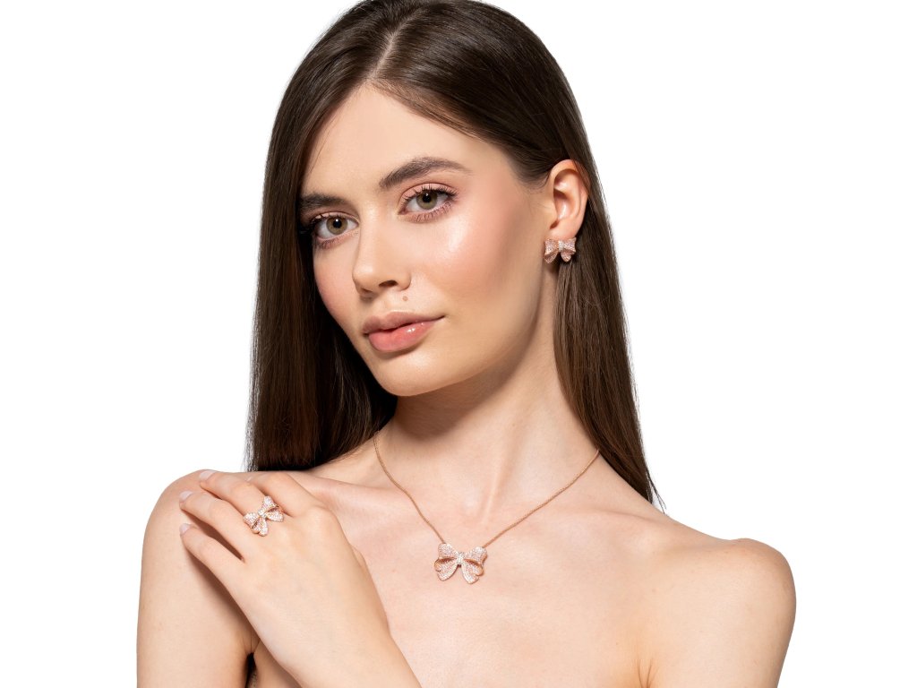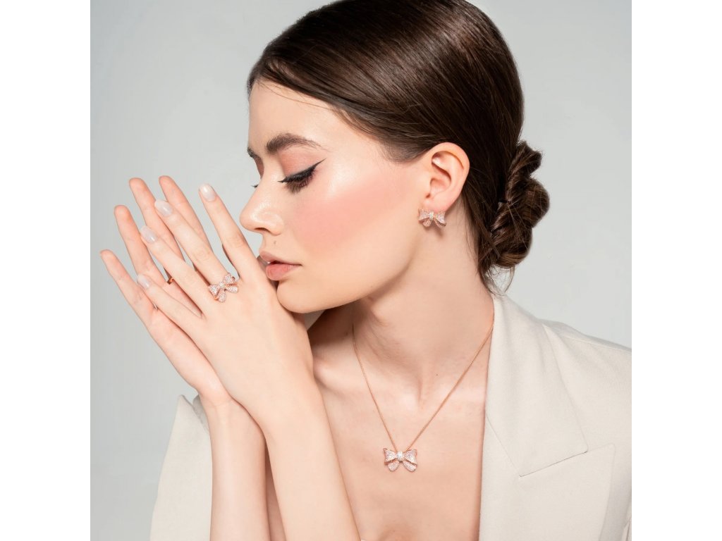 Tyto náušnice jsou nejen šperkem, ale také uměleckým dílem. Jsou ve tvaru mašle a vyrobeny ze stříbra, pozlaceného 18 karátovým růžovým zlatem, zdobené růžovými a bílými zirkony.