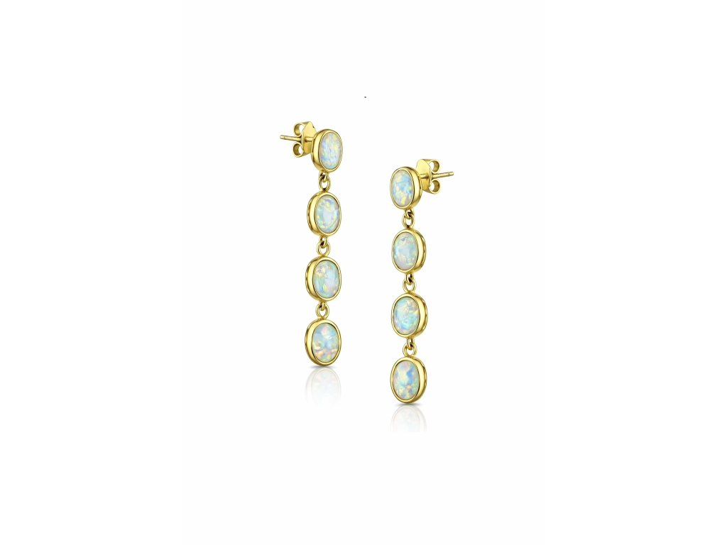 Tyto luxusní zlaté visací náušnice s opály okouzlí svou jedinečnou barevností a elegantním provedením. Řetězec několika oválných opálů vytváří působivý efekt pohybu a odráží světlo v jemných duhových tónech.
