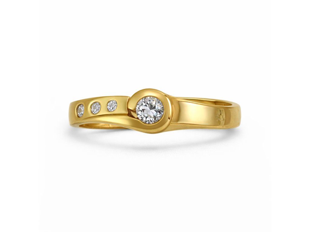Tento elegantní prsten ze 14karátového zlata zaujme svým jemně asymetrickým designem, který propojuje klasiku s moderním šperkařským stylem. Dominantou prstenu je centrální zirkon zasazený do hladkého kulatého lůžka, který působí čistě, výrazně a přirozeně přitahuje pozornost.