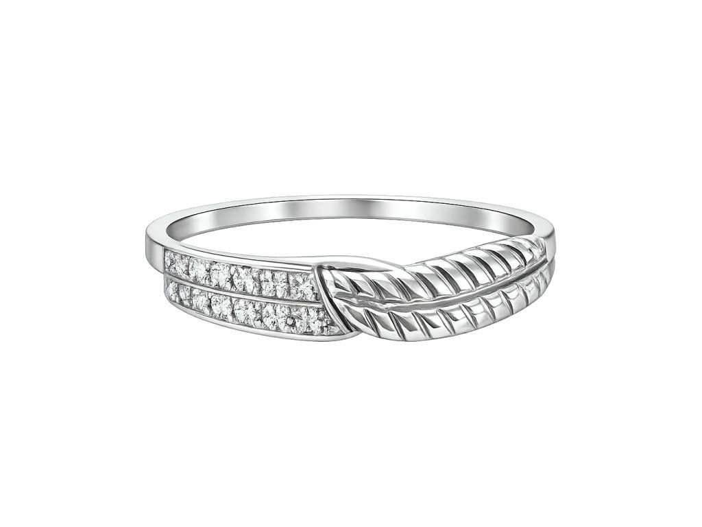 Jemný a elegantní prsten z bílého 14karátového zlata zaujme moderním propleteným designem, který symbolizuje spojení a harmonii. Kombinace hladkého lesklého povrchu s jemně strukturovanou částí dodává šperku zajímavý kontrast a nadčasový charakter.