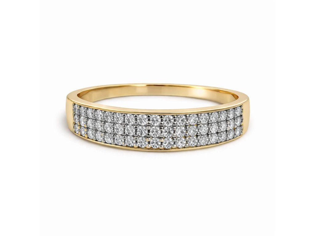 Horní část prstenu je zdobena řadami precizně zasazených kamenů (zirkony/diamanty), které odrážejí světlo z každého úhlu a dodávají šperku výrazný lesk. Hladké okraje ze žlutého zlata krásně kontrastují s osazenou plochou a podtrhují jeho čistý, moderní vzhled.