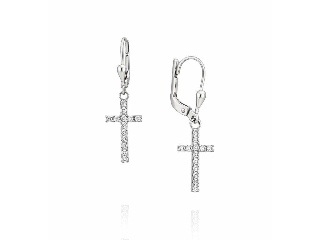 Tyto zlaté visací náušnice z bílého zlata zdobí decentní přívěsek ve tvaru křížku, osazený drobnými zirkony. Jemný třpyt kamenů dodává šperku elegantní a čistý vzhled, který působí velmi nadčasově.