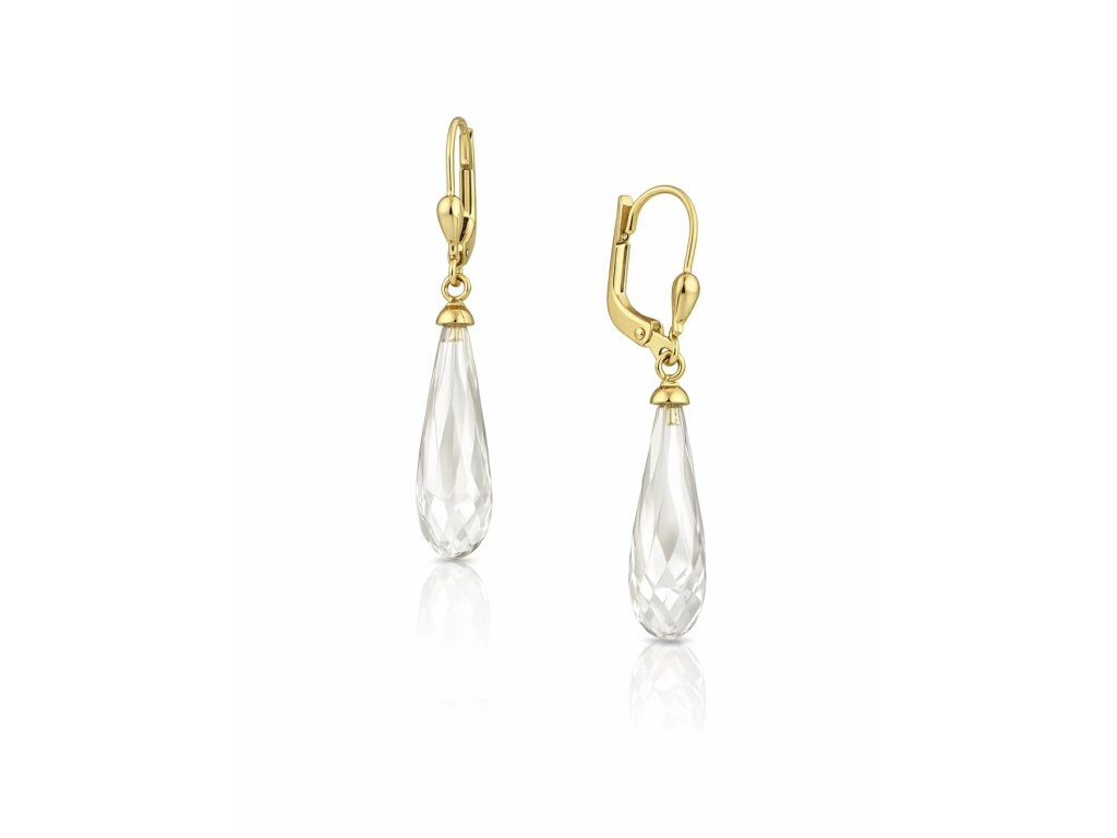 Tyto zlaté visací náušnice zaujmou nadčasovým kapkovým designem a jemně broušeným čirým krystalem, který krásně odráží světlo a vytváří elegantní třpyt. Kombinace žlutého zlata a průzračného kamene působí luxusně, ale zároveň velmi jemně.