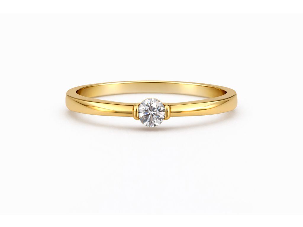 Elegantní prsten ze 14karátového zlata s dominantním centrálním zirkonem představuje dokonalou kombinaci jednoduchosti a luxusu. Precizně zasazený kámen vyniká svou brilancí a čistotou, čímž přitahuje pozornost při každém pohybu ruky.