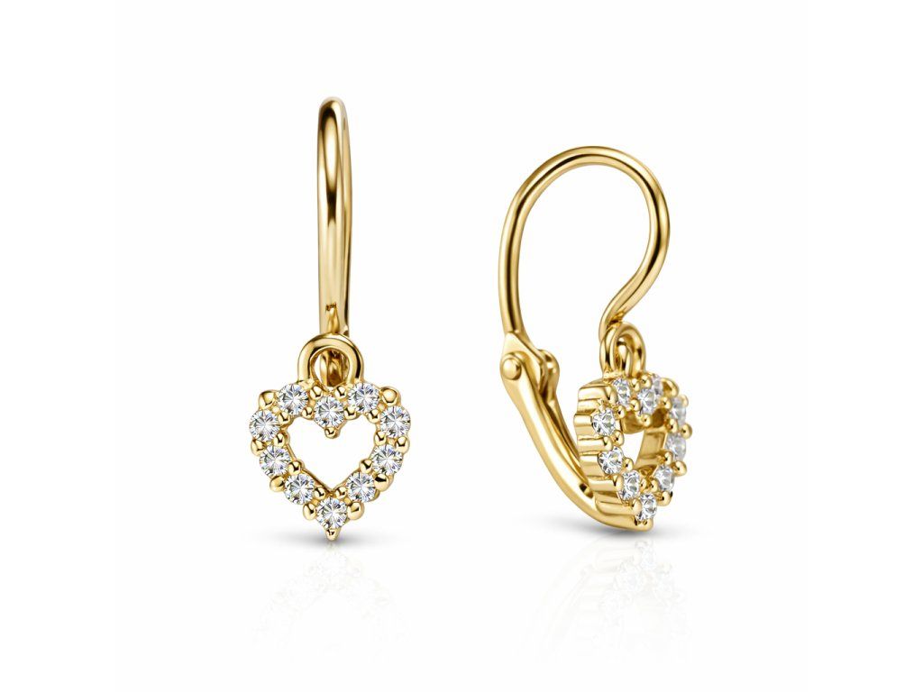 Tyto dětské zlaté náušnice zaujmou něžným motivem srdíčka, které je osazeno drobnými třpytivými kameny. Kombinace žlutého zlata a jemného lesku vytváří elegantní, ale zároveň hravý šperk ideální pro malé slečny.