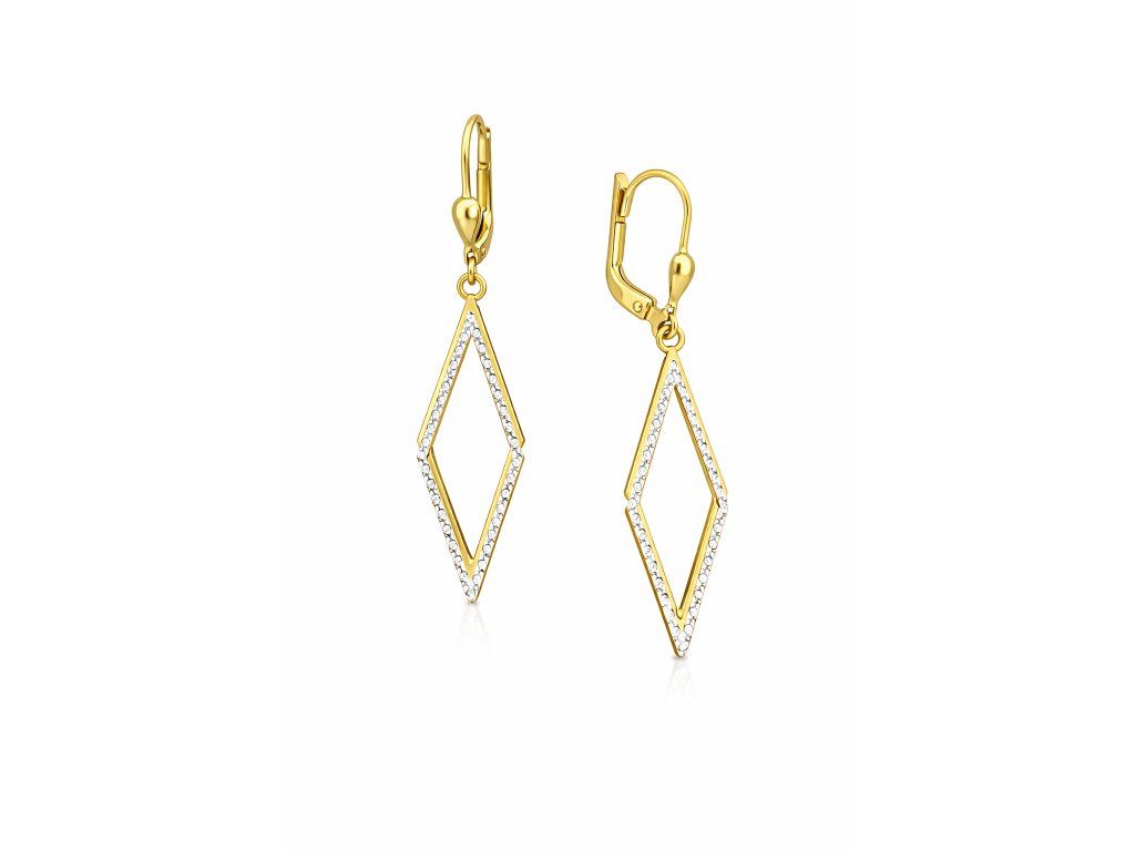 Tyto luxusní zlaté visací náušnice vynikají moderním geometrickým tvarem kosočtverce a precizním zpracováním. Povrch náušnic je zdoben jemným broušeným dekorem ve zlatě, který vytváří efekt třpytu bez použití kamenů. Díky tomu působí šperk elegantně, čistě a zároveň velmi nadčasově.