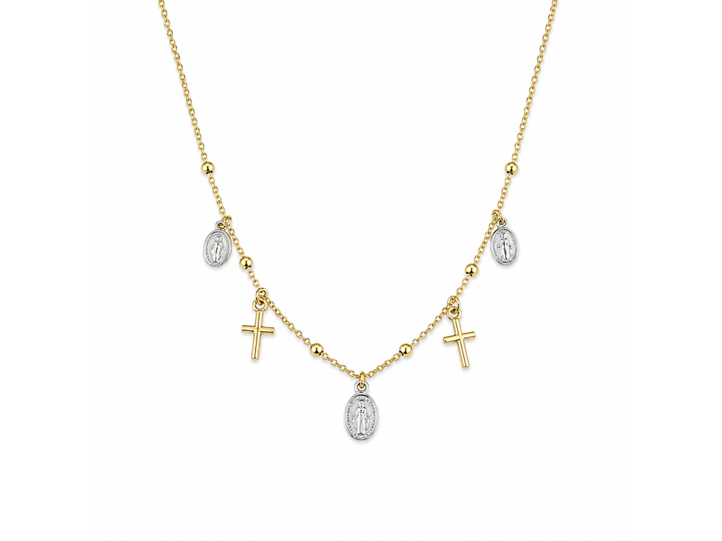 Tento elegantní náhrdelník ze 14kt zlata zaujme svým sofistikovaným designem a symbolickým významem. Jemný řetízek je doplněn drobnými kuličkami a zdoben visacími prvky – zlatými křížky a kontrastními medailonky v bílém zlatě s motivem Madony.