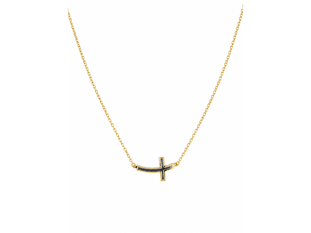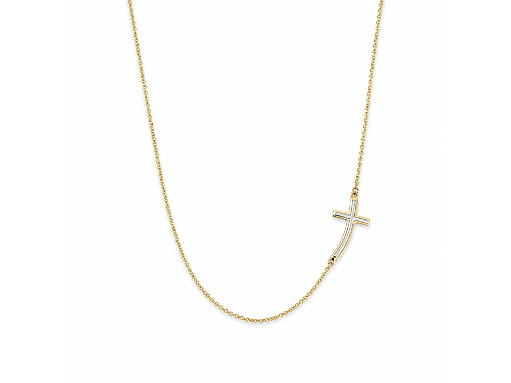 Křížek je proveden v kombinaci žlutého a bílého zlata, což vytváří jemný kontrast a podtrhuje jeho čisté linie. Díky lehkému zakřivení působí design dynamicky a přirozeně se přizpůsobuje linii krku.