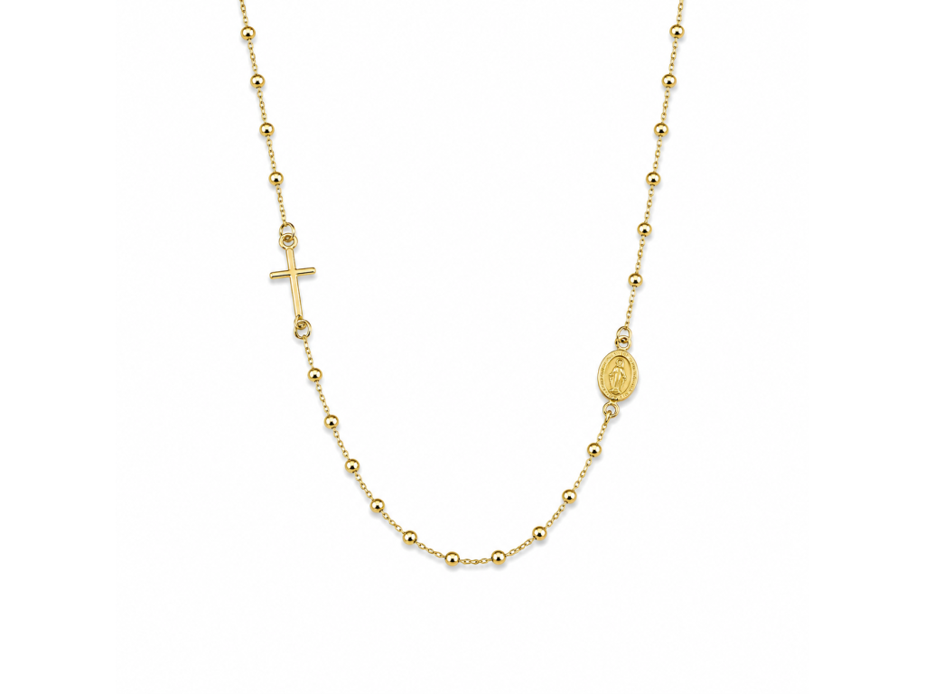 Elegantní zlatý náhrdelník vyniká harmonickým propojením jemného řetízku s drobnými kuličkami, decentního křížku a detailně zpracovaného medailonku. Celek působí velmi čistě, luxusně a nadčasově, díky čemuž je ideální jak pro každodenní nošení, tak i pro výjimečné příležitosti.