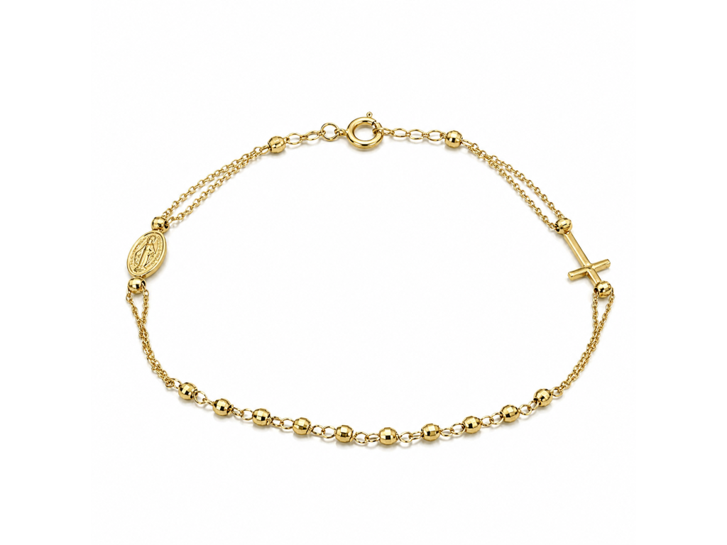 Zlatý náramek s kuličkami, křížkem a medailonkem – jemná elegance s duchovním symbolem