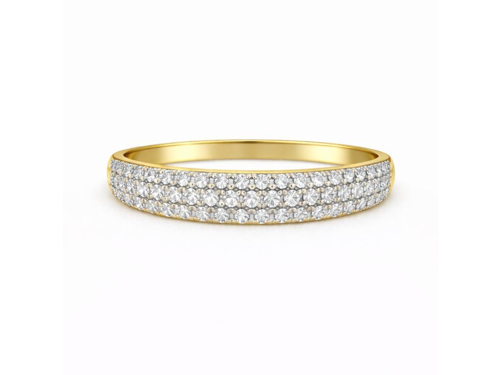 Tento elegantní prsten ze 14karátového zlata je osazen hustou řadou drobných zirkonů ve stylu pavé, které vytvářejí nepřetržitý, oslnivý třpyt po celé horní části šperku. Precizní zasazení kamenů zajišťuje maximální odraz světla a dodává prstenu výrazný, luxusní charakter.