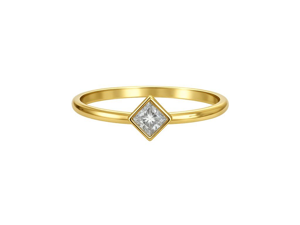 Minimalistický zlatý prsten z 14karátového zlata zaujme svou čistotou a jemnou elegancí. Dominantním prvkem je centrální čtvercový zirkon zasazený do geometrického rámečku, který podtrhuje moderní a nadčasový charakter šperku.